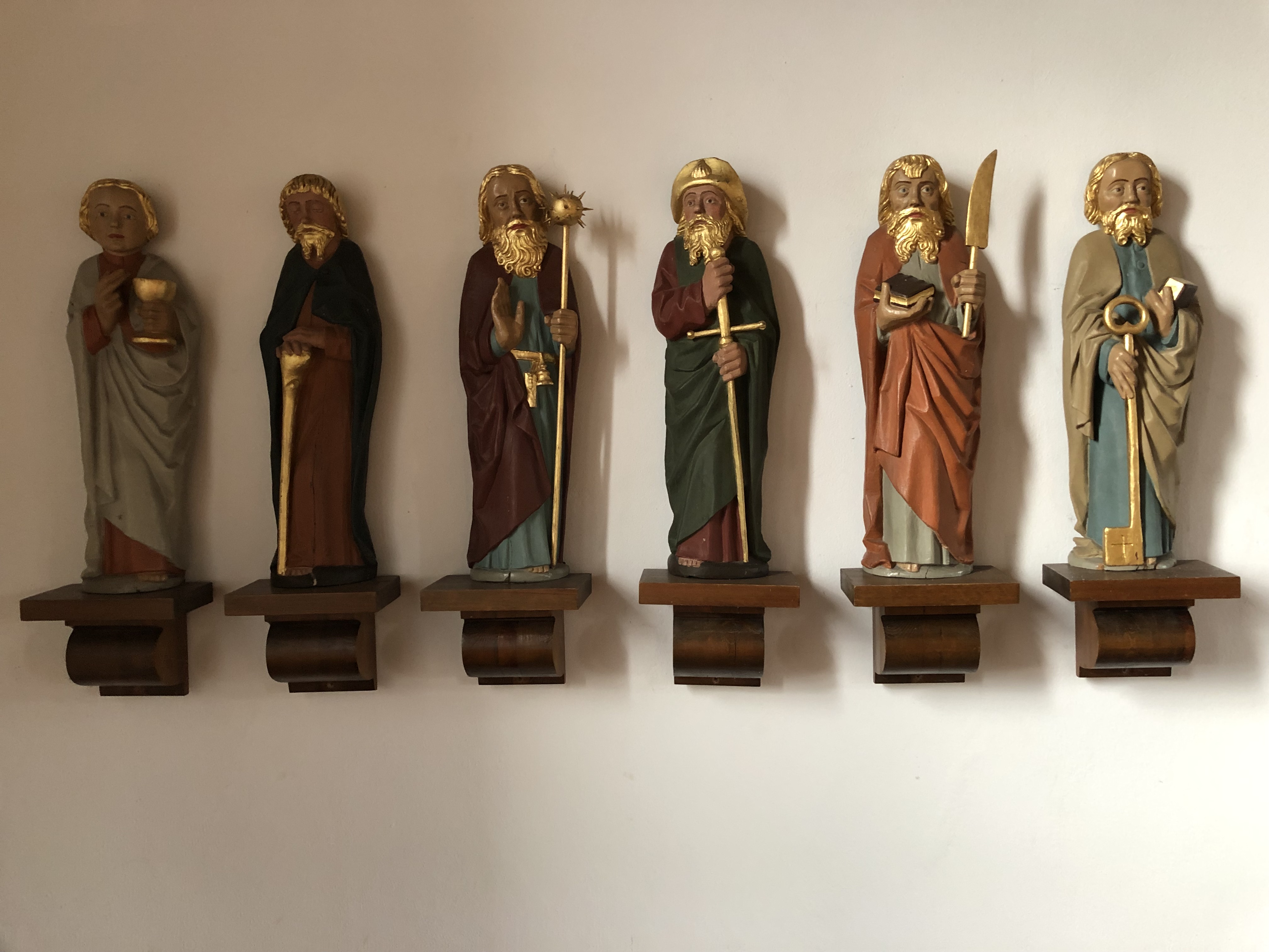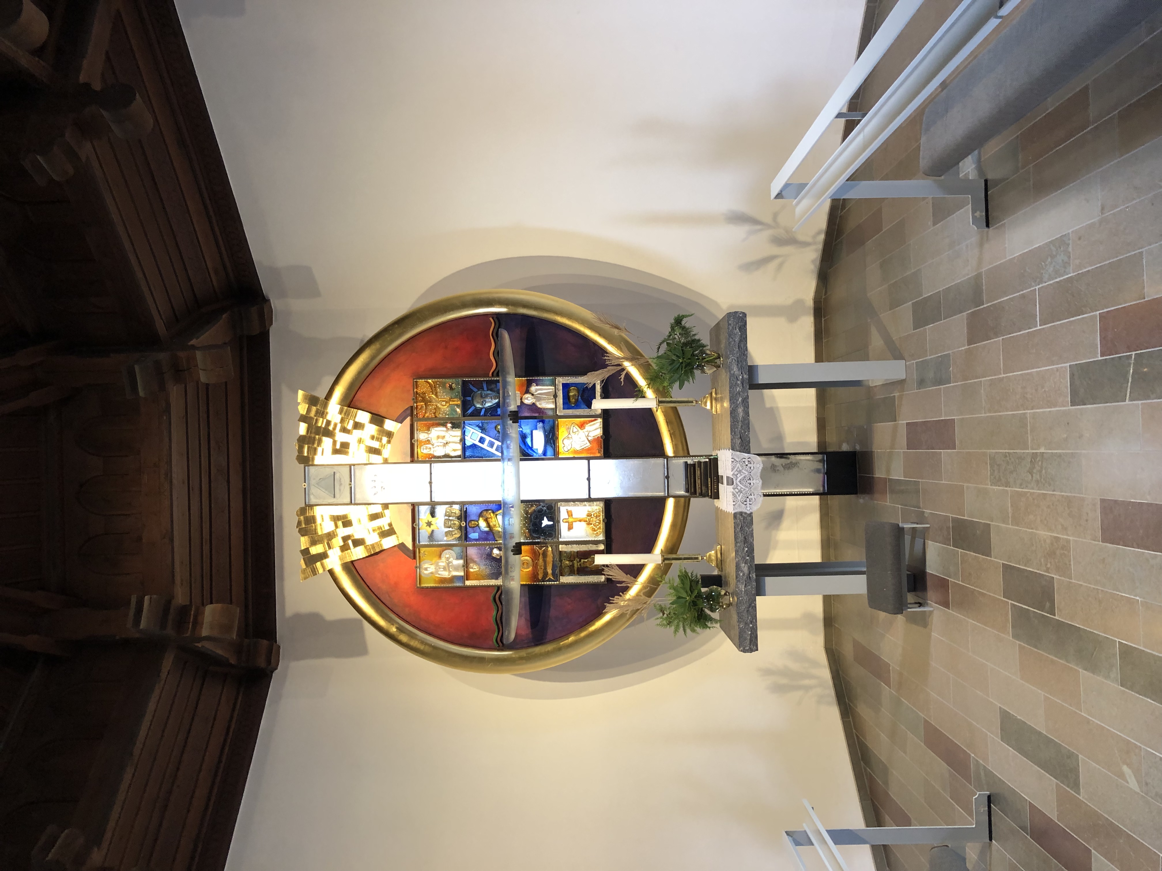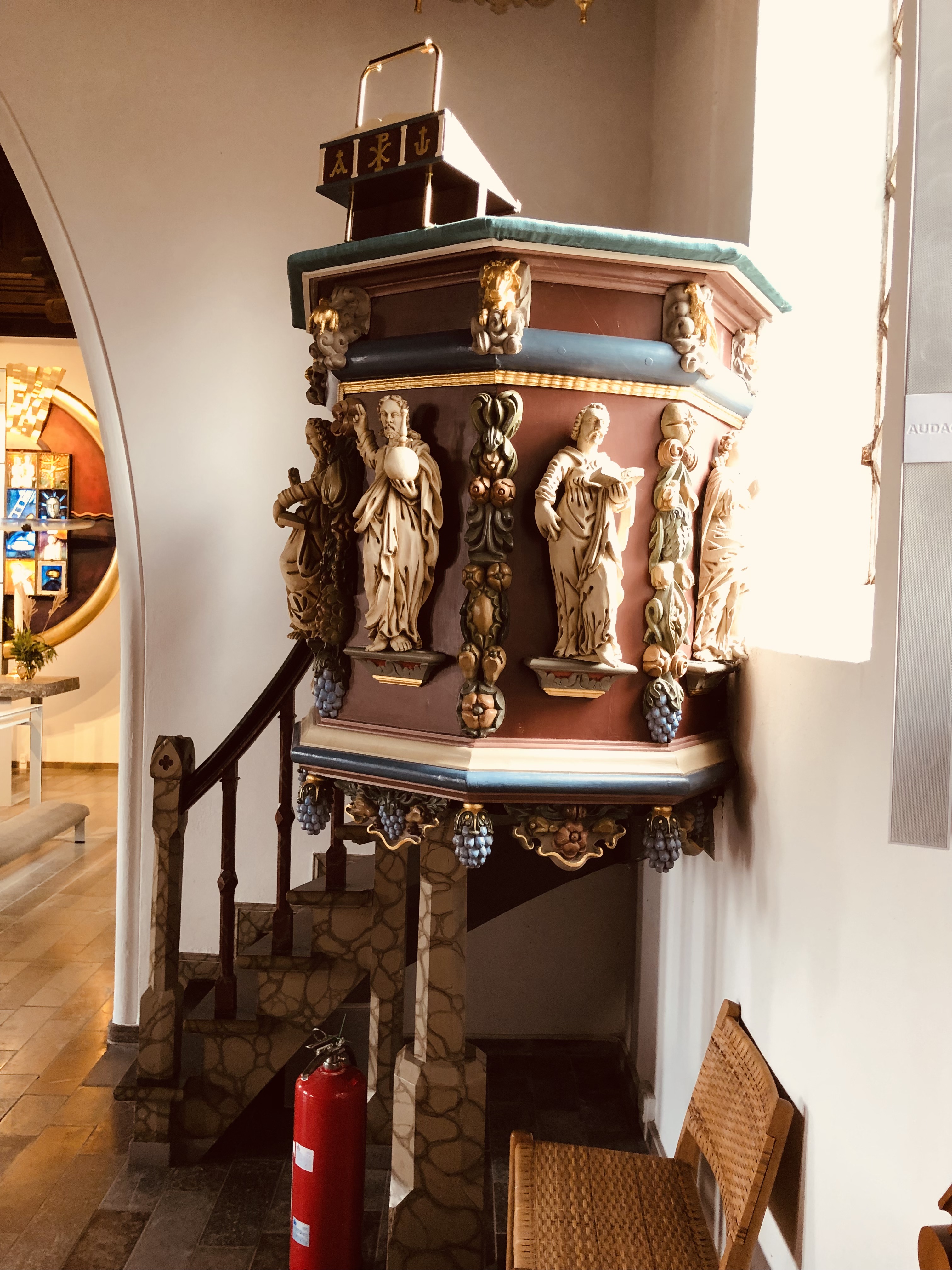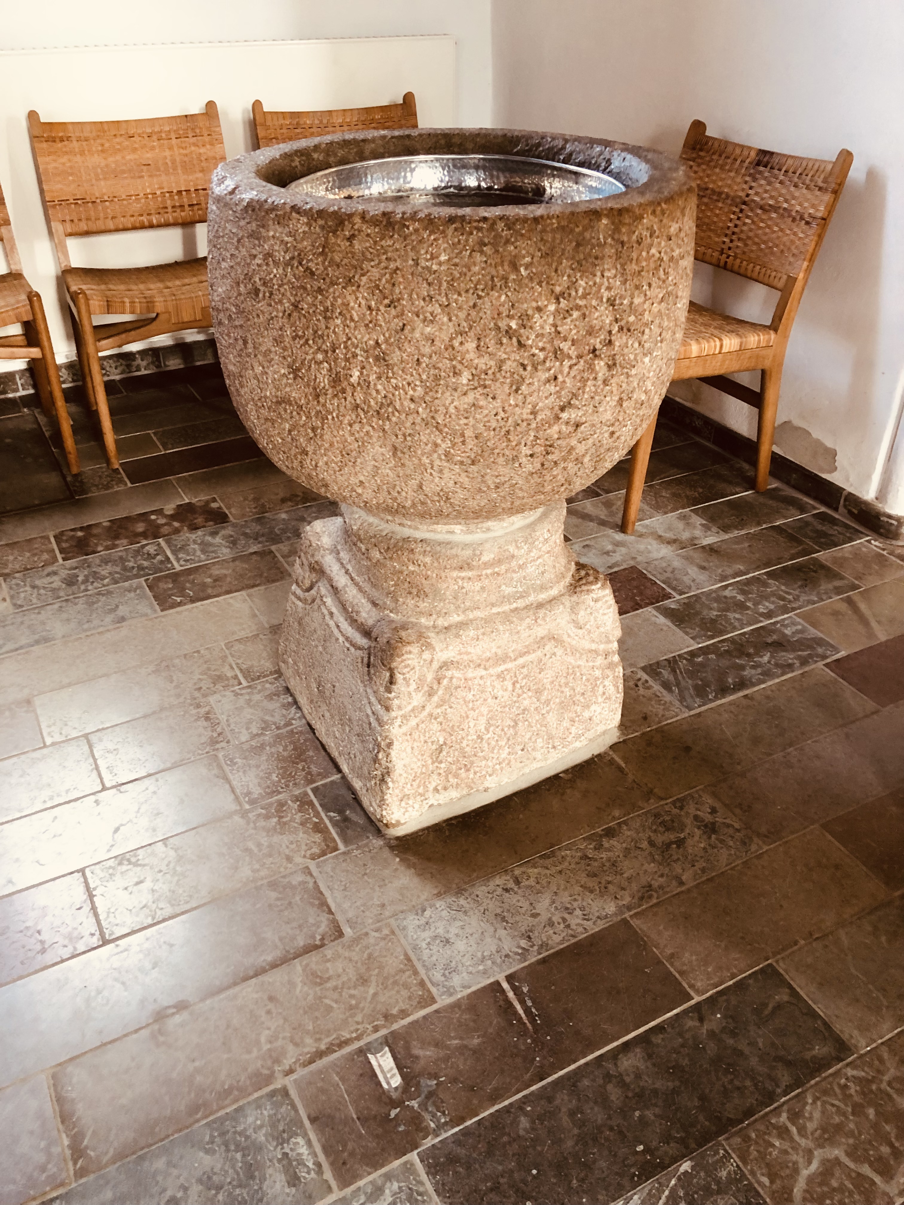 | Prædikestolen (o. 1675) er fra den tidl. kirke. | Altertavlens glasmosaik "Mod lyset" af Bertel Vallien er fra 2017. | Romansk døbefont, kirkens ældste inventarstykke. | Dåbsfadet på væggen er sydtysk fra o. 1550-75. |